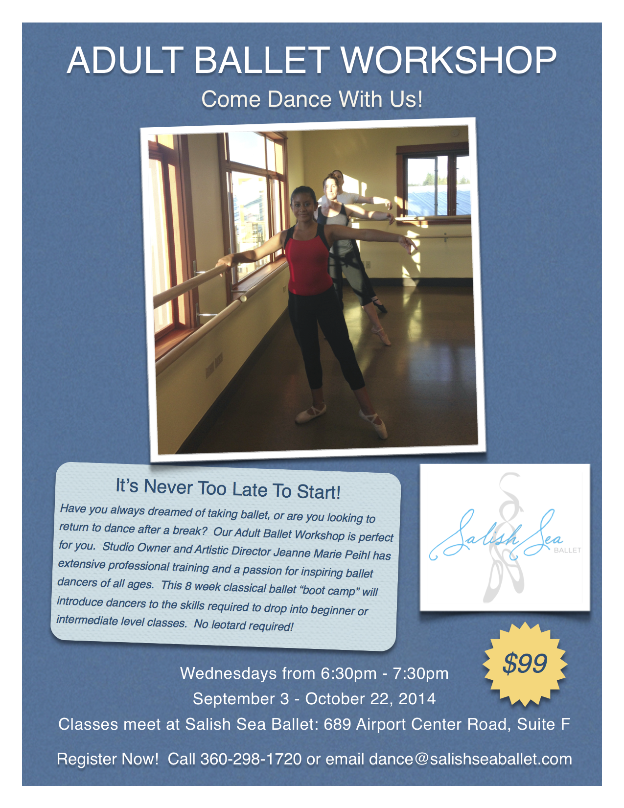 Have you always dreamed of taking ballet, or are you looking to return to dance after a break? It’s never too late to start! Our Adult Ballet Workshop is perfect for you. Studio Owner & Artistic Director Jeanne Marie Peihl has extensive professional training and a passion for inspiring ballet dancers of all ages. This 8 week classical ballet “boot camp” will introduce dancers to the skills required to drop into beginner or intermediate level classes. No leotard required!