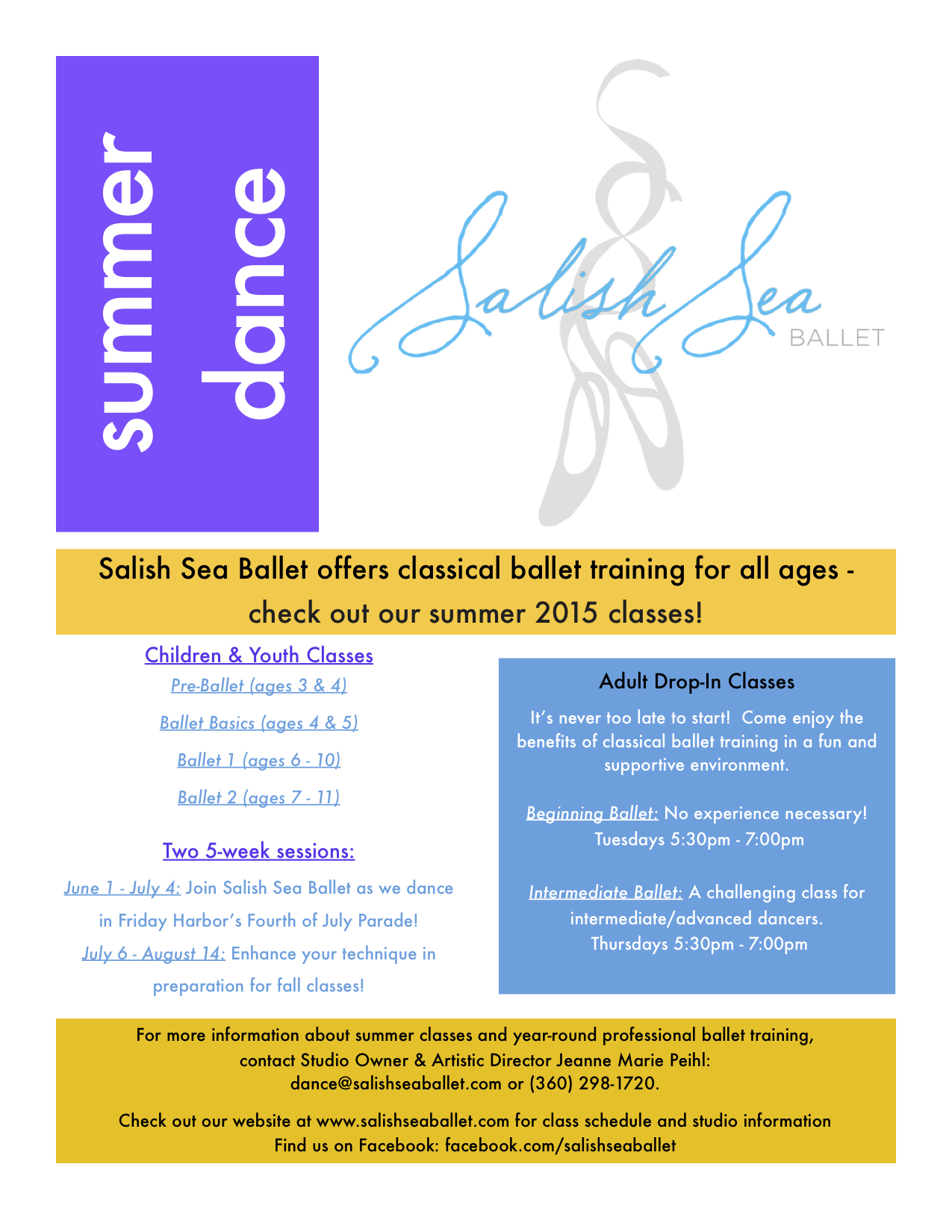 Session 2 (July 6 – August 14): 5 weeks of accelerated classes to jump start students for the new school year. Challenging curriculum and individual attention give students extra preparation for fall classes. Ballet 1 and Ballet 2 classes in this session include a formal assessment class (structured like an audition) and parent/teacher/student conference to discuss class placement for fall 2015. Please Note: Salish Sea Ballet will be closed from July 28-August 3.