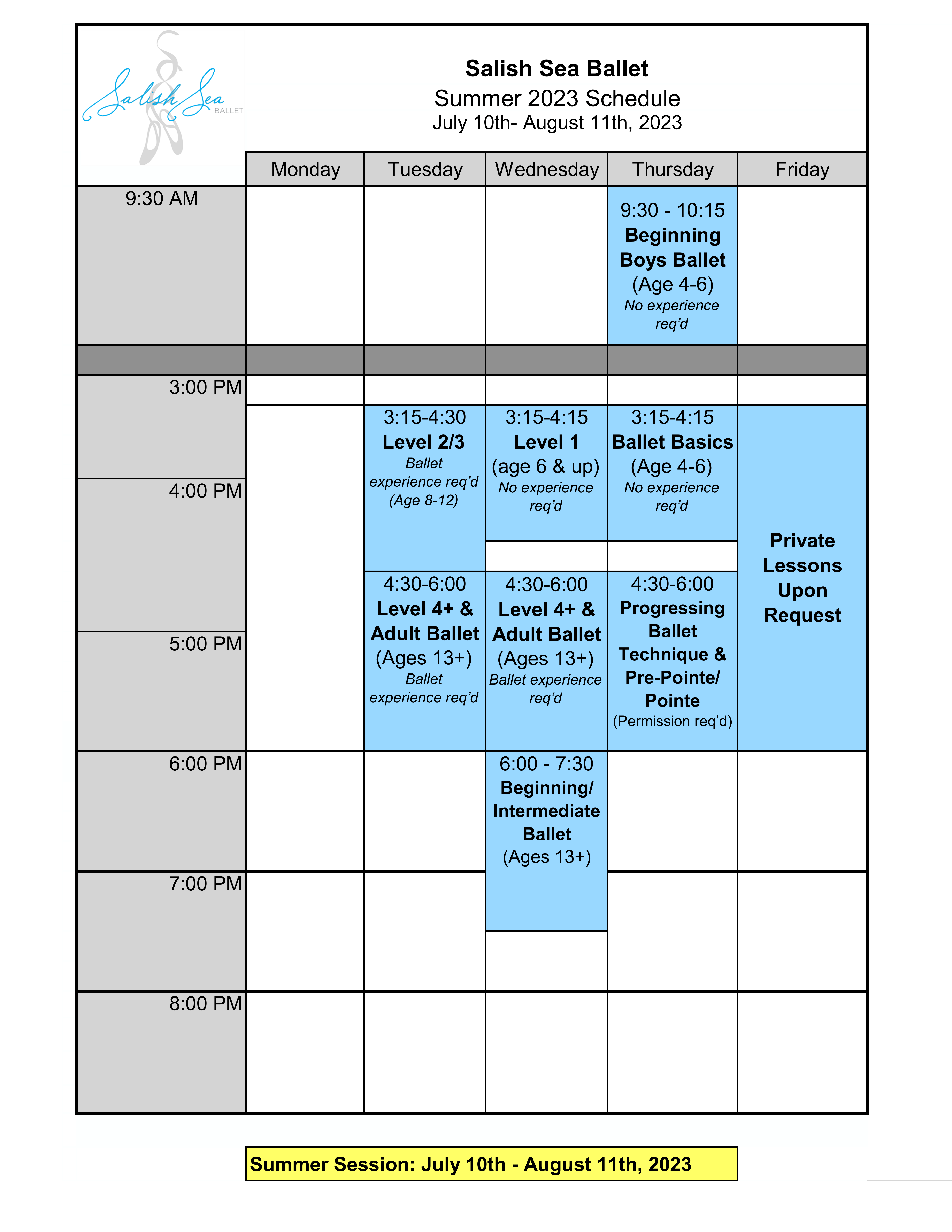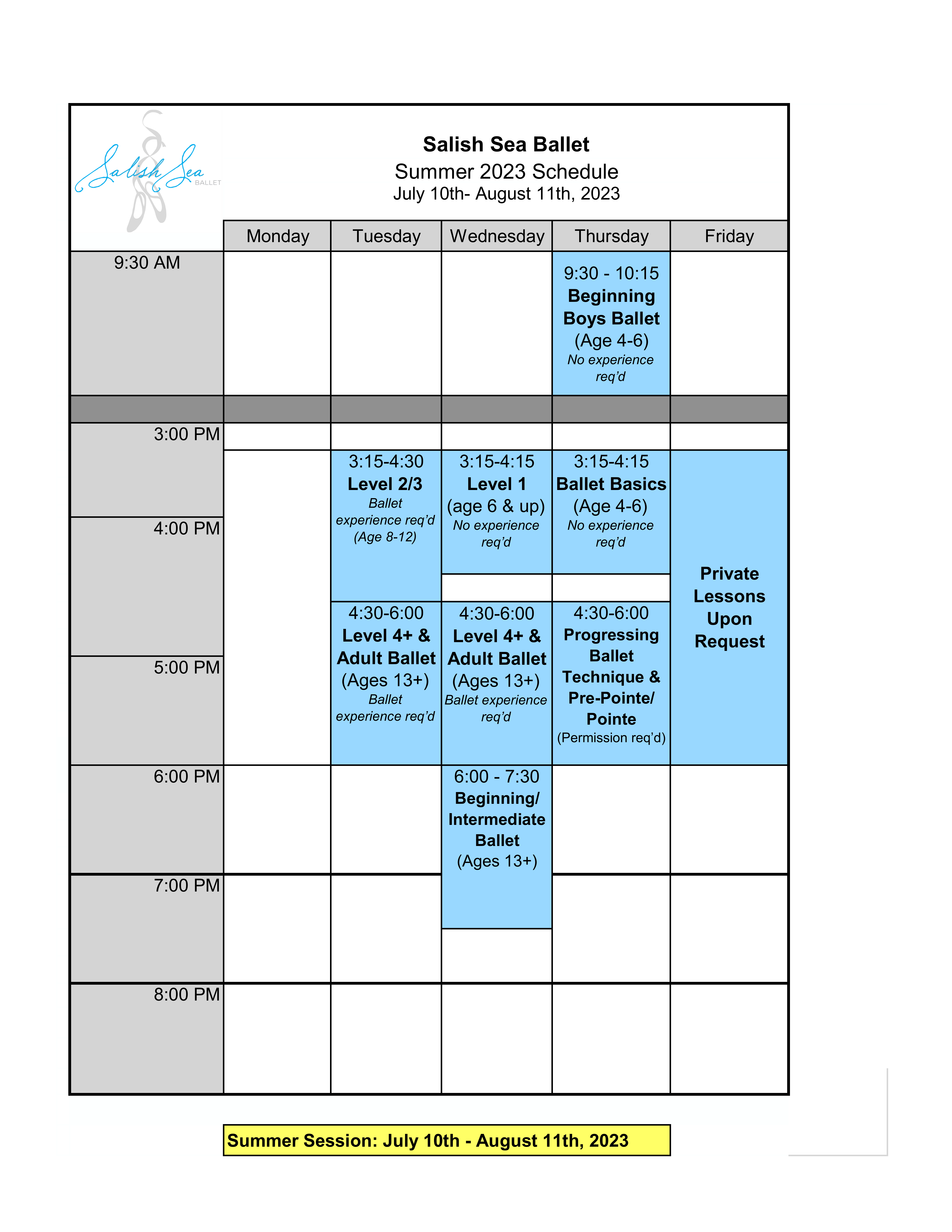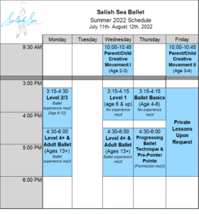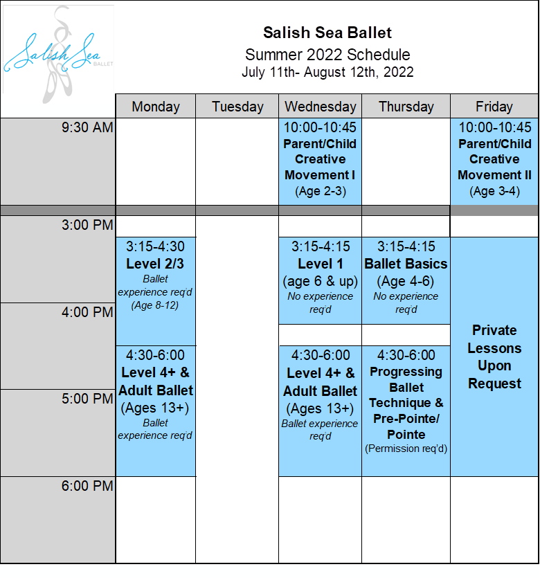Summer at Salish Sea Ballet is full of opportunity! We offer a variety of dance programming for children and adults that complements our popular year-round classical ballet program. From ballet to custom classes, we can create a dance experience for everyone. Contact us for details about individual or group private lessons. Private lessons are scheduled based on the instructor’s and interested student(s) availability. Private lessons can be weekly, bi-weekly and offered in the morning or the afternoon. New and visiting students are welcome.
