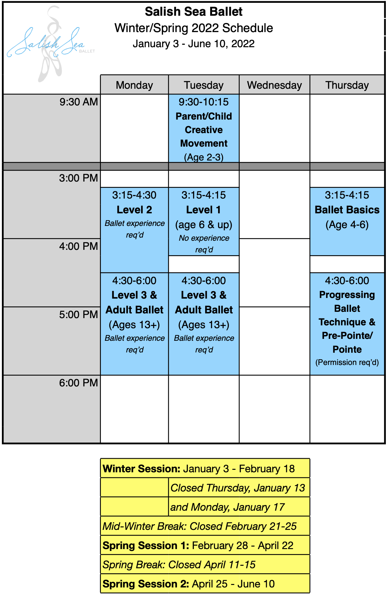 The winter schedule is below. Please look carefully as some class days and times have been adjusted! Private lesson slots are not currently shown on the schedule and will be booked at a later date, pending staff availability.