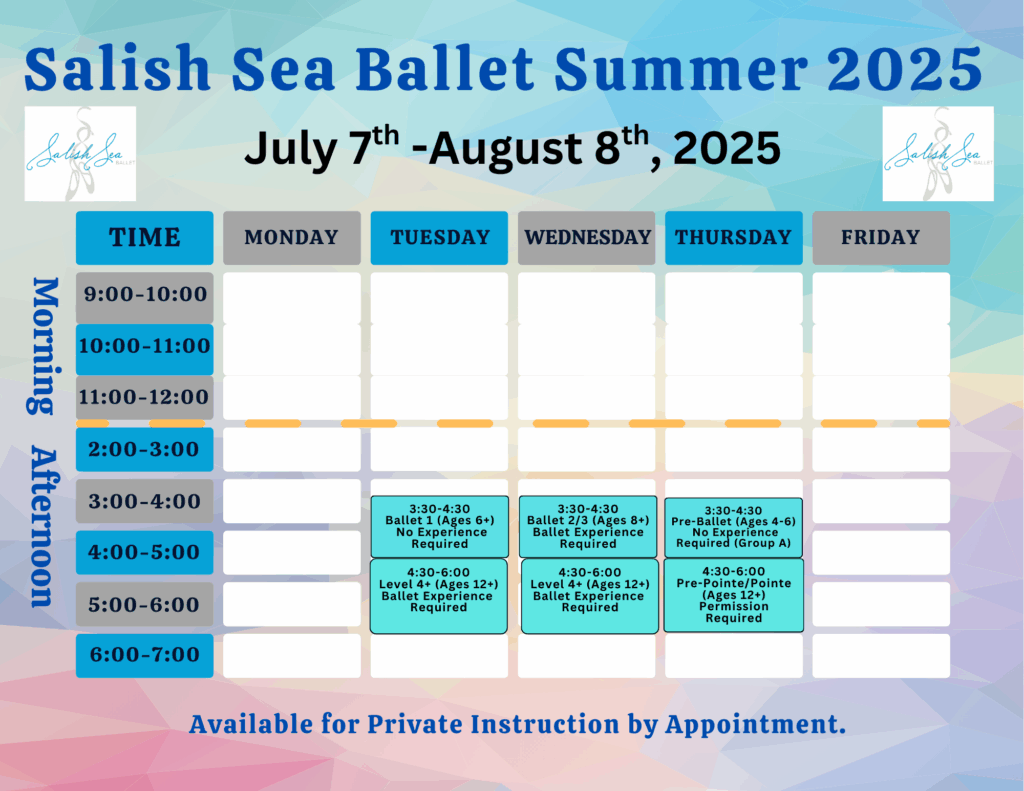Summer at Salish Sea Ballet is full of opportunity! We offer a variety of dance programming for children and adults that complements our popular year-round classical ballet program. From ballet to custom classes, we can create a dance experience for everyone. Contact us for details about individual or group private lessons. Private lessons are scheduled based on the instructor’s and interested student(s) availability. Private lessons can be weekly, bi-weekly and offered in the morning or the afternoon. New and visiting students are welcome.